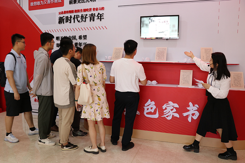 “紅色家書”互動(dòng)墻前,一封封“紅色家書”通過數(shù)字智能互動(dòng)技術(shù)播放,團(tuán)員青年們駐足閱讀,認(rèn)真聆聽,追憶革命先輩家國情懷,體悟感受信仰力量。