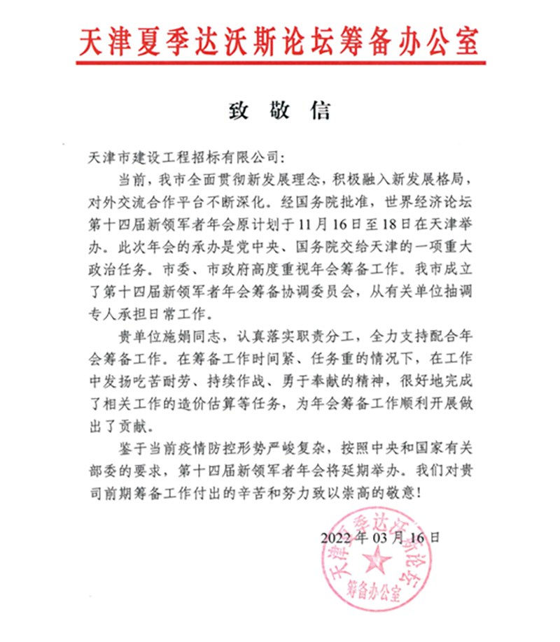 日前,天咨公司所屬招標公司收到天津夏季達沃斯論壇籌備辦公室發來的致敬信,充分肯定了招標公司為天津夏季達沃斯論壇年會籌備工作所作的積極努力。
