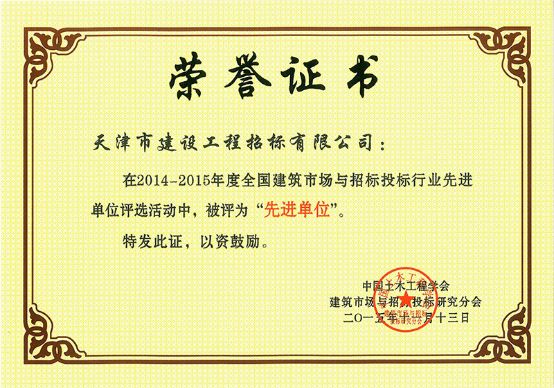 14-15年全國(guó)建筑市場(chǎng)與招標(biāo)投標(biāo)行業(yè)先進(jìn)單位 更新時(shí)間:2021-09-24 點(diǎn)擊:1433 所屬欄目:資質(zhì)榮譽(yù)