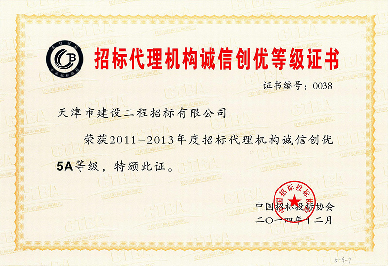 2011-2013年度招標(biāo)代理機(jī)構(gòu)誠信創(chuàng)優(yōu)5A等級(jí) 更新時(shí)間:2021-09-24 點(diǎn)擊:1485 所屬欄目:資質(zhì)榮譽(yù)